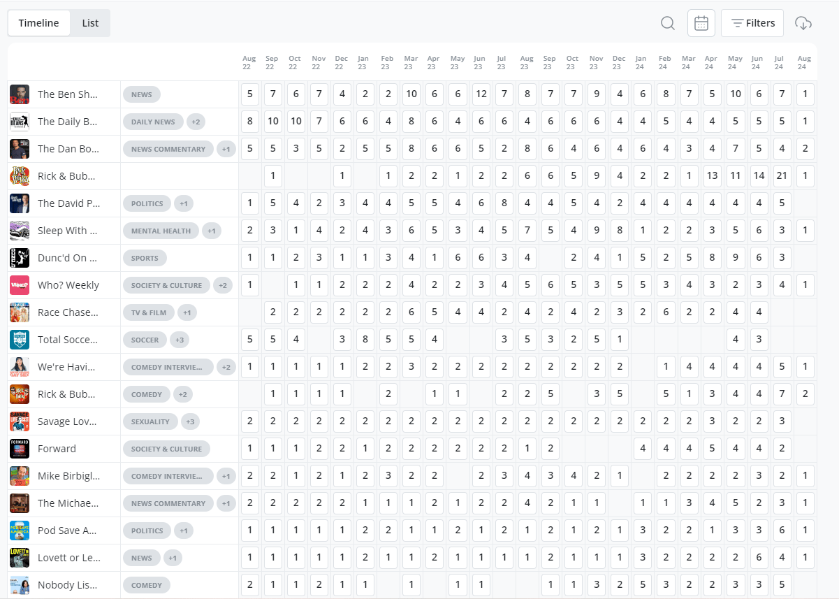 Some networks would consolidate shows into one feed that was more popular to have a higher upload frequency to then sell more impressions. Putting low-influence hosts on high-influence shows with their feed to inherit the downloads from the main feed making it more sellable.