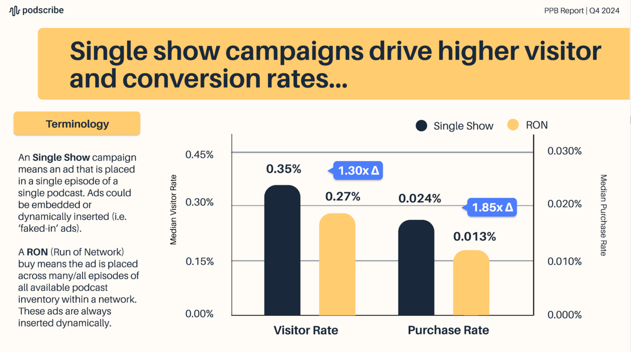 Not all RONs are equal. Some publishers/podcasts allow large numbers of ads per episode, do not allow show-level tracking, and ask for rates that don’t actually make sense for you to bite at.